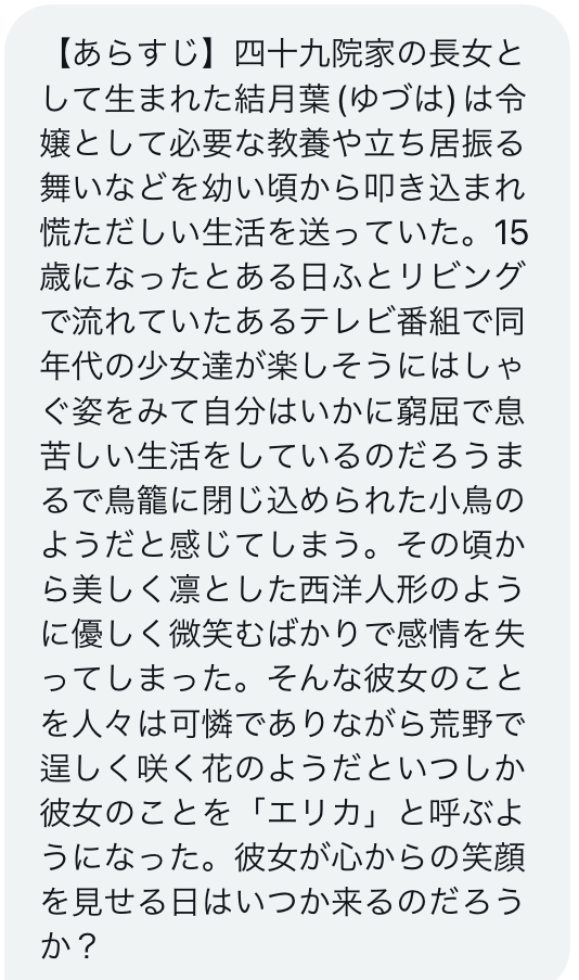 四十九院家の長女として生まれた結月葉(ゆづは)は令嬢として必要な教養や立ち居振る舞いなどを幼い頃から叩き込まれ慌ただしい生活を送っていた。15歳になったとある日ふとリビングで流れていたあるテレビ番組で同年代の少女達が楽しそうにはしゃぐ姿をみて自分はいかに窮屈で息苦しい生活をしているのだろうまるで鳥籠に閉じ込められた小鳥のようだと感じてしまう。その頃から美しく凛とした西洋人形のように優しく微笑むばかりで感情を失ってしまった。そんな彼女のことを人々は可憐でありながら荒野で逞しく咲く花のようだといつしか彼女のことを「エリカ」と呼ぶようになった。彼女が心からの笑顔を見せる日はいつか来るのだろうか?