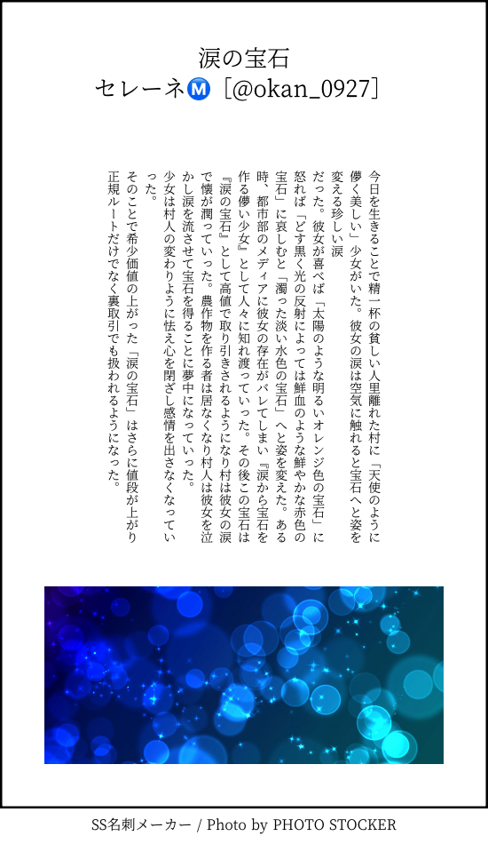 今日を生きることで精一杯の貧しい人里離れた村に「天使のように儚く美しい」少女がいた。彼女の涙は空気に触れると宝石へと姿を変える珍しい涙だった。彼女が喜べば「太陽のような明るいオレンジ色の宝石」に怒れば「どす黒く光の反射によっては鮮血のような鮮やかな赤色の宝石」に哀しむと「濁った淡い水色の宝石」へと姿を変えた。ある時、都市部のメディアに彼女の存在がバレてしまい『涙から宝石を作る儚い少女』として人々に知れ渡っていった。その後この宝石は『涙の宝石』として高値で取り引きされるようになり村は彼女の涙で懐が潤っていった。農作物を作る者は居なくなり村人は彼女を泣かし涙を流させて宝石を得ることに夢中になっていった。