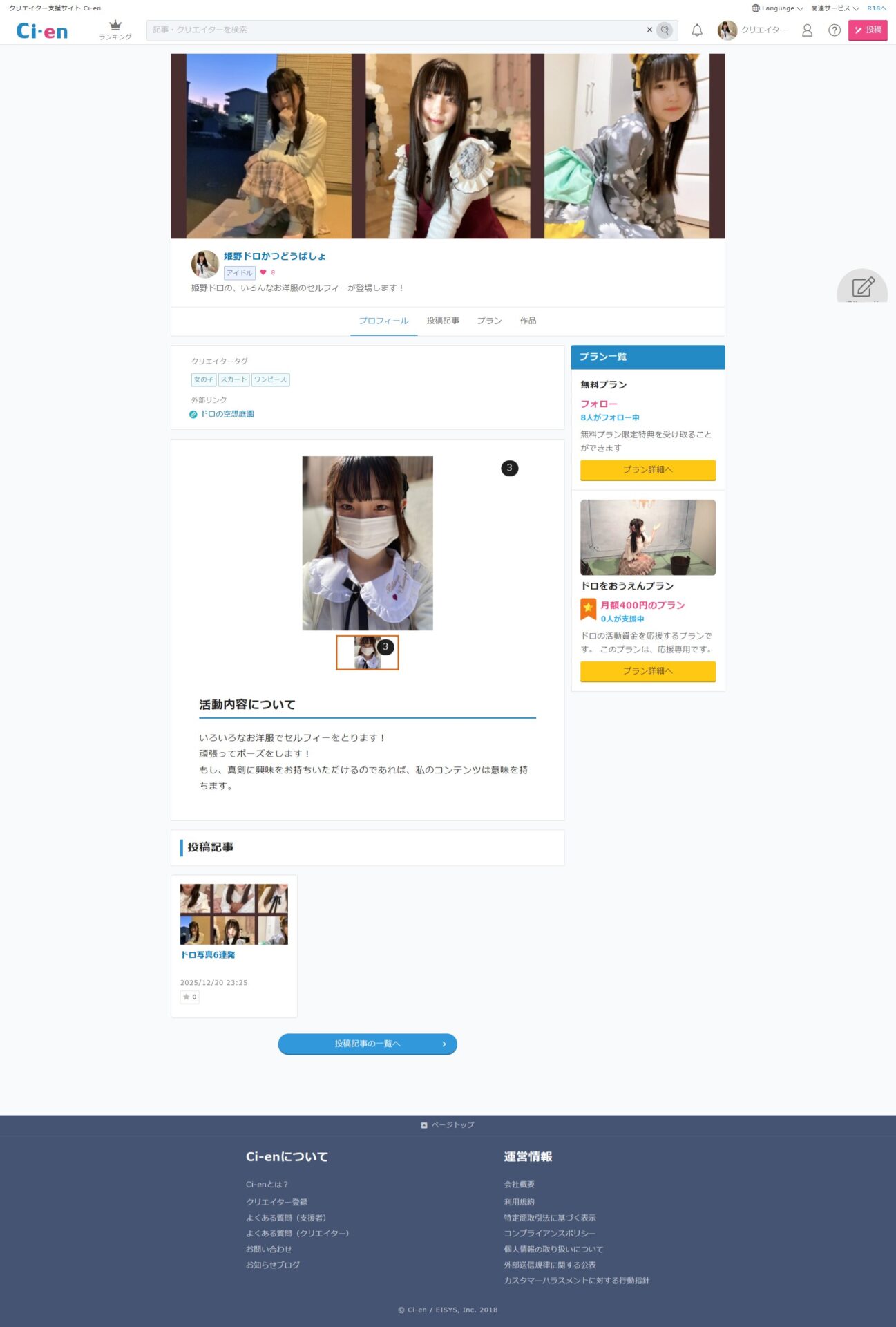 姫野ドロかつどうばしょのプロフィールです。姫野ドロの、いろんなお洋服のセルフィーが登場します!|最新の記事は「ドロ写真6連発」です。 - Ci-en(シエン)